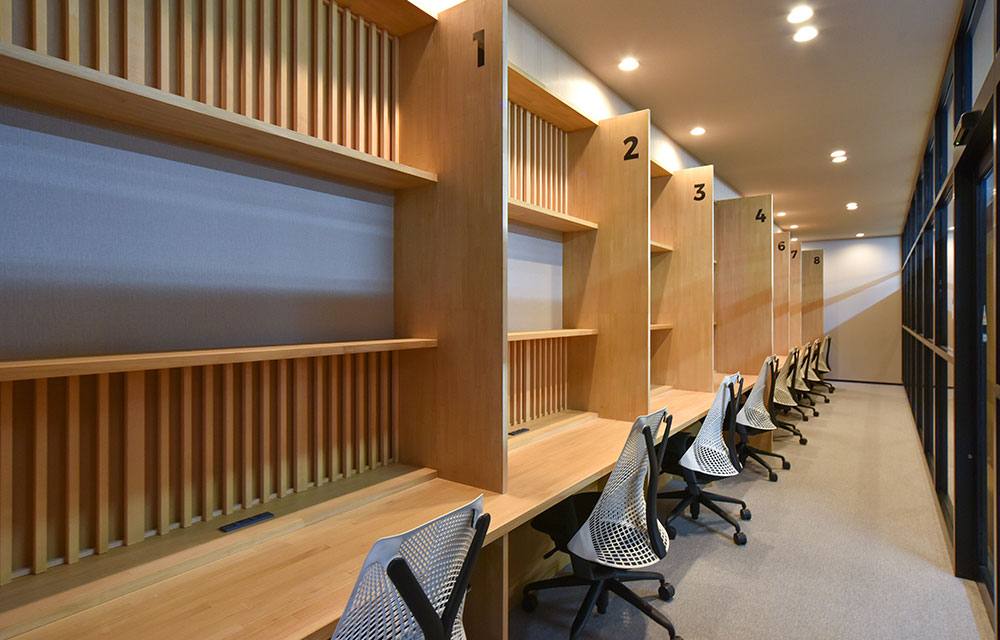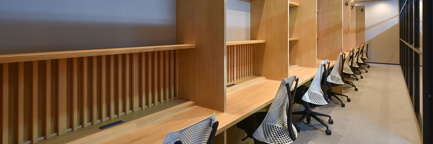 集中ブースです。壁に面した本棚とワークチェア(Herman Miller社)を備えた集中ブースが8席あります。